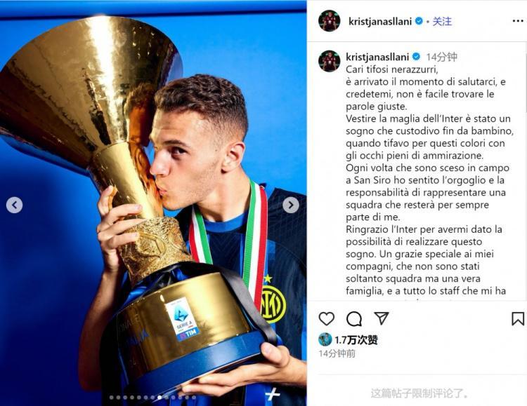 九游娱乐-阿斯拉尼社媒告别:感谢所有支持我的人,国米将永远在我心中